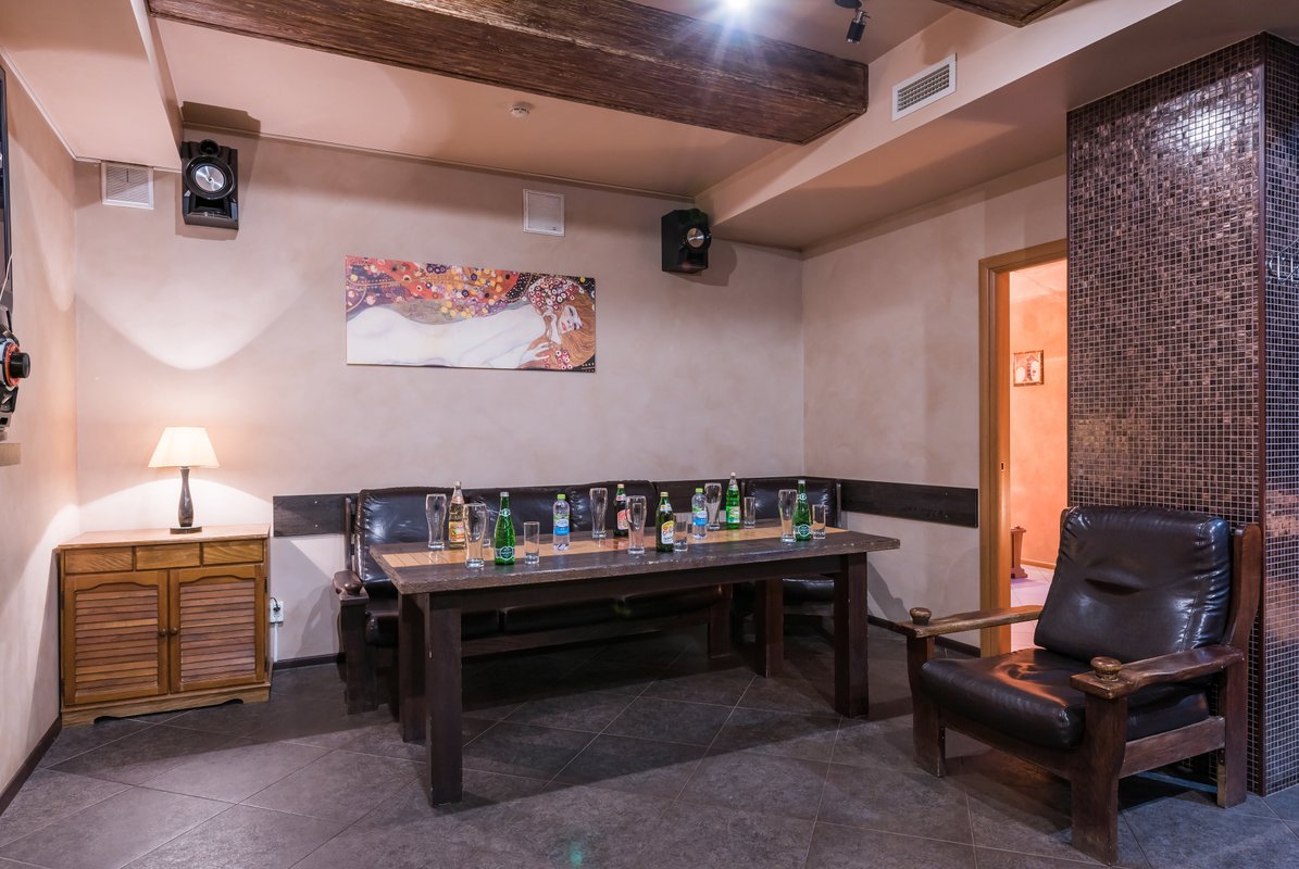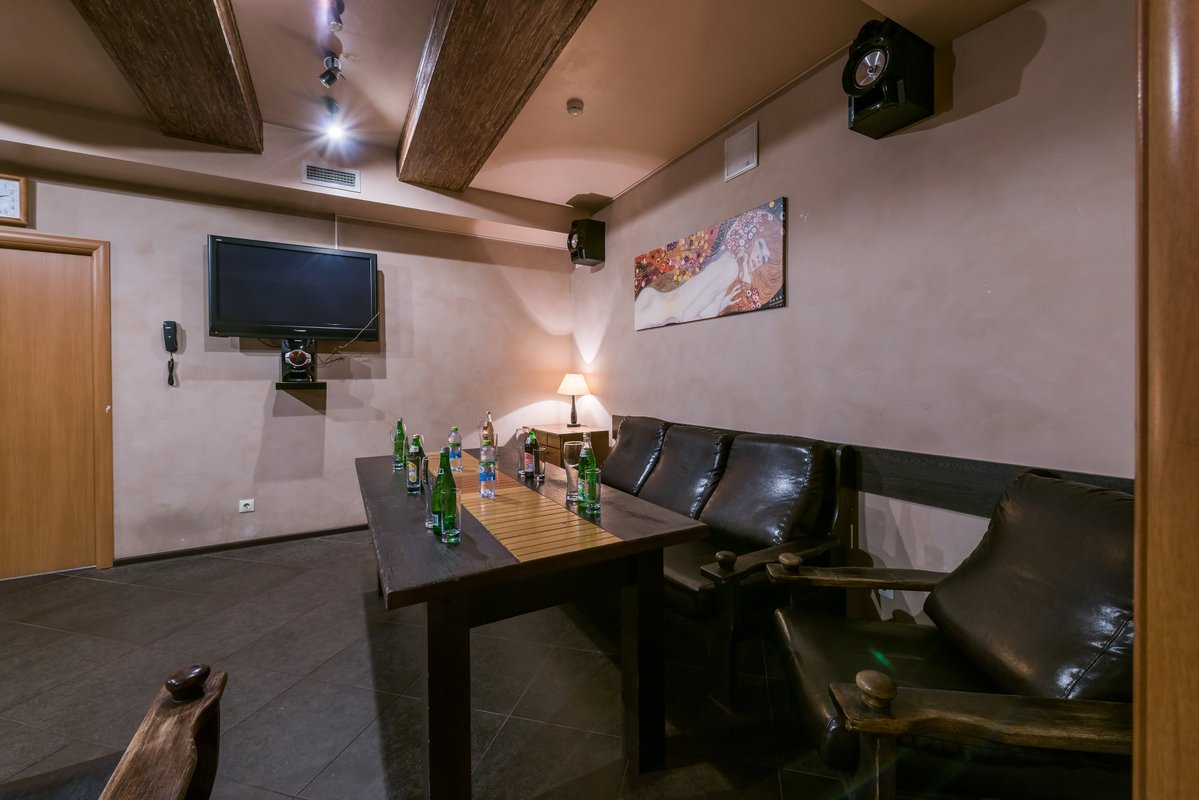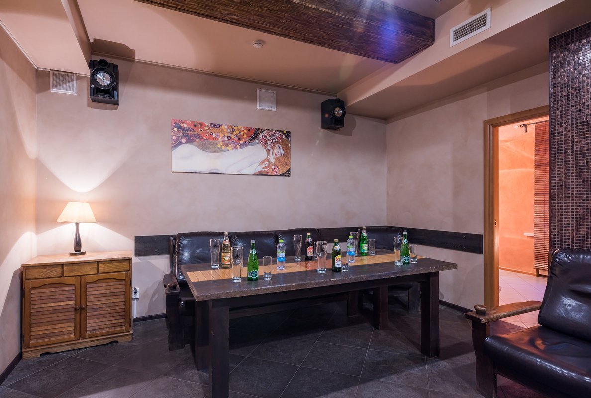 Не хочется в бассейн? Не проблема! Вместо этого можно посидеть в нашей комнате отдыха. Мы постарались создать здесь комфортный, стильный интерьер из максимально натуральных, экологичных материалов, выбрать мебель, которая будет одновременно удобной и эстетичной. Надеемся, что вам понравится! Для создания настроения у нас есть кальян и караоке. Также у нас работает бар, где вы можете заказать блюда русской кухни, а если нужно, прийти и с собственной едой - мы не против! Только не забывайте, что плотная трапеза непосредственно перед посещением парной - это не самая хорошая идея, согласно мнению терапевтов. А вот после парной - совсем другое дело!