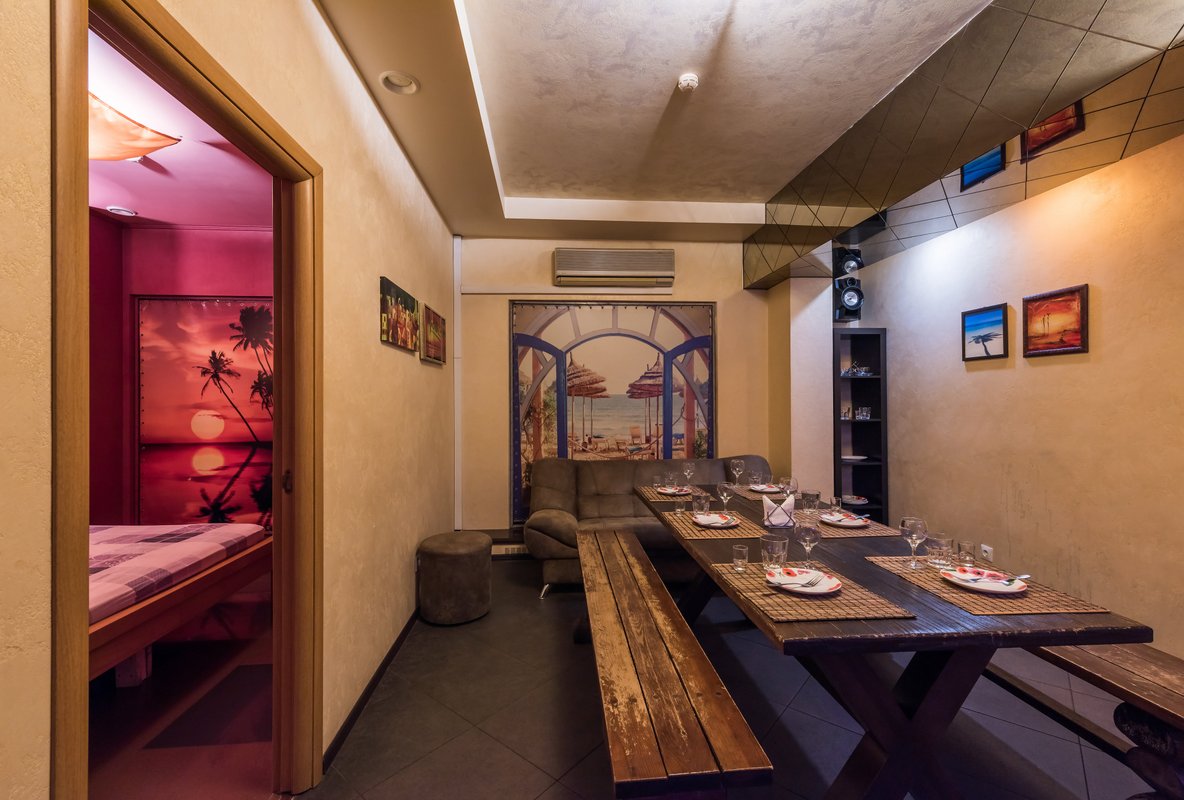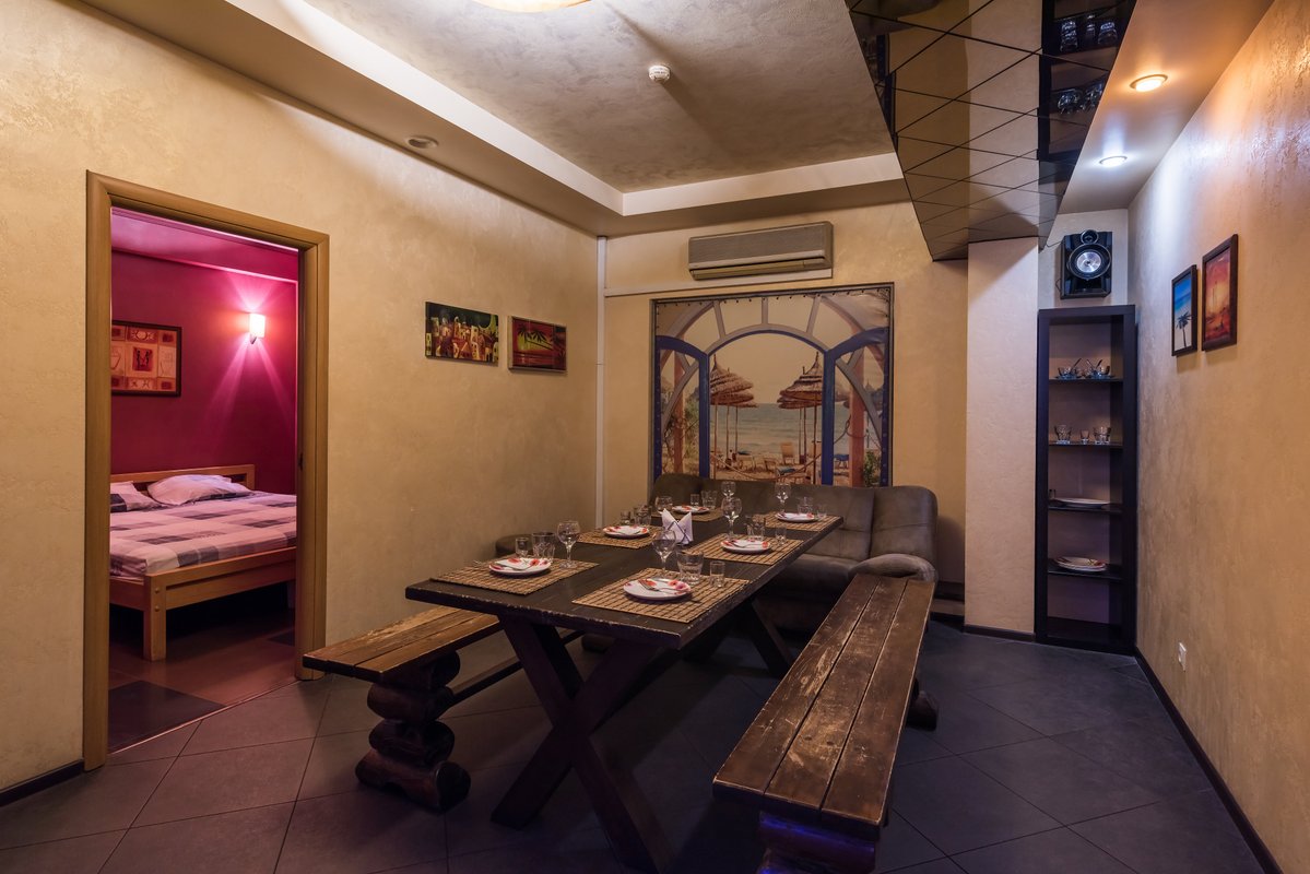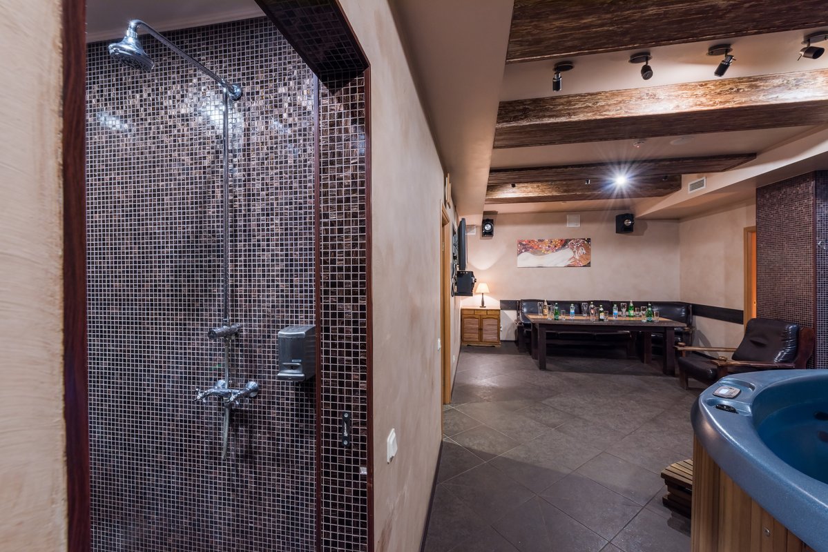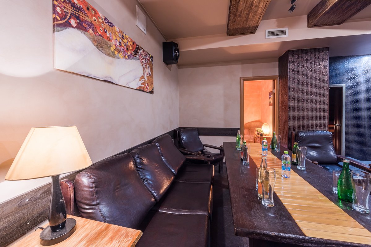 Не хочется в бассейн? Не проблема! Вместо этого можно посидеть в нашей комнате отдыха. Мы постарались создать здесь комфортный, стильный интерьер из максимально натуральных, экологичных материалов, выбрать мебель, которая будет одновременно удобной и эстетичной. Надеемся, что вам понравится! Для создания настроения у нас есть кальян и караоке. Также у нас работает бар, где вы можете заказать блюда русской кухни, а если нужно, прийти и с собственной едой - мы не против! Только не забывайте, что плотная трапеза непосредственно перед посещением парной - это не самая хорошая идея, согласно мнению терапевтов. А вот после парной - совсем другое дело!